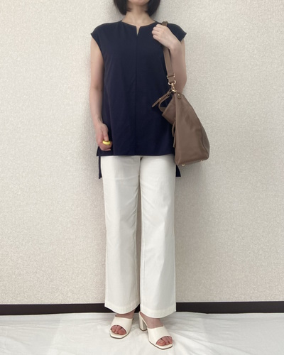 今回使ったネイビーのボトムスとも相性のいいカラーです。