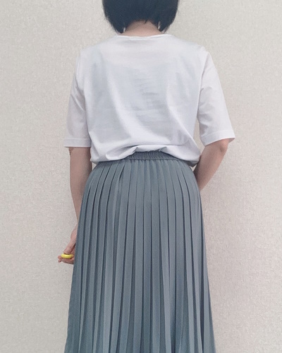 ボトムスに選んだのは、この時期の景色になじむミントグリーンのプリーツスカートです。
