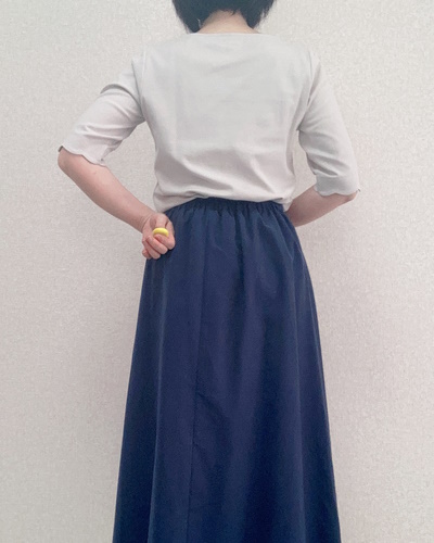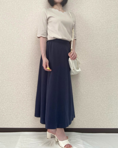Tシャツを主役にするため、シンプルなネイビーのフレアスカートを合わせました。