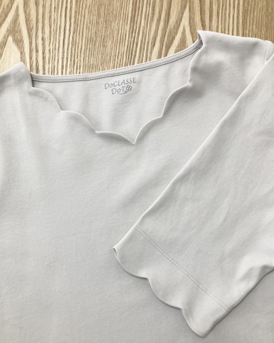 最大の特徴は「首元と袖のスカラップ」