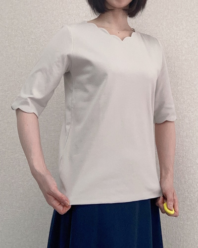 5分袖で二の腕をカバーしつつ、スカラップでフェミニンに味つけ。