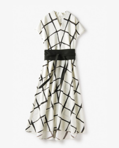 ウィンドウペンというレトロなチェック柄に、サッシュベルトをアクセントにしたワンピース。上質さとトレンドの両方を求める女性に、ぜひまとっていただきたい一枚です。襟のVネックや袖の開き具合が絶妙で、スカート部分は美しいフレアを描きます。40代50代のドレスアップに求められる、さり気ないトレンド感と体をきれいに見せるシルエットを押さえ、洗練された華やかさに導いてくれます。記念日、会食、同窓会のほか、旅先でのディナーにもおすすめです。ベルトを外してシンプルに着用することもできます。