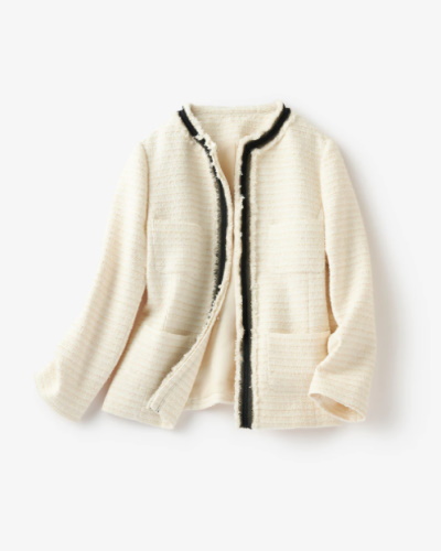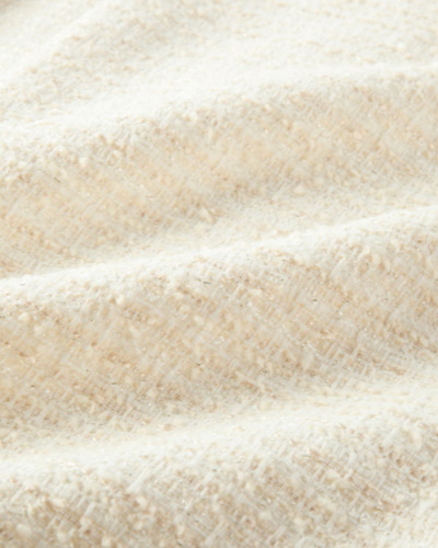 フォーマルシーンや母としての行事に役立つのは、仕立ての良いミックスツイードのジャケットです。複数の糸をミックスして、異なる織り方を組み合わせているので、トラディショナルでありながらも華やかに映えます。明るいオフホワイトはお祝いの気持ちをあらわすのにぴったり。入園式や入学式などハレの日に最適で、大人のライフスタイルでは活用の場が多いアイテムです。