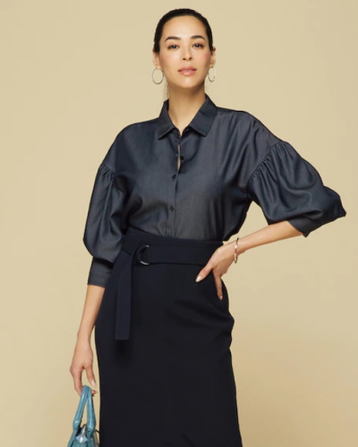 控えめなパフスリーブのブラウスは、甘さが気になる方でも安心して着こなせるアイテムです。シンプルなブラウスは無難になりやすいですが、胸元に鋭角のカッティングがほどこされているため、どこか他とは違う洗練感が漂います。二の腕が隠れるパーフェクトなデザインで、上着を脱いだ姿に自信を持てるようになりそうです。