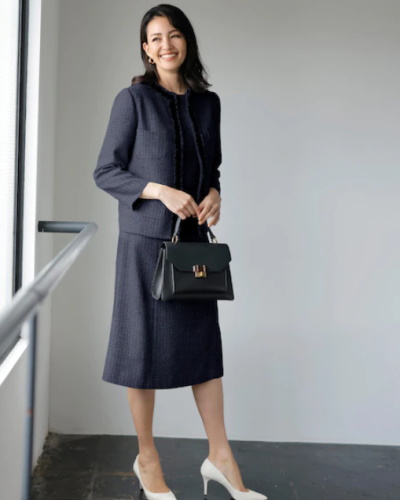 お子さんの卒業を祝う卒業式では、フォーマル感と華やかさを兼ね備えた、ツイードのセットアップがおすすめです。ジャケットとワンピースは、ともに落ち着きのあるベーシックなデザインで、ワンサイズ細く見える立体裁断となっています。この立体裁断はハイブランドを経験したパタンナーによるもの。卒業式だけでなく、入学式、謝恩会などにも着まわせます。