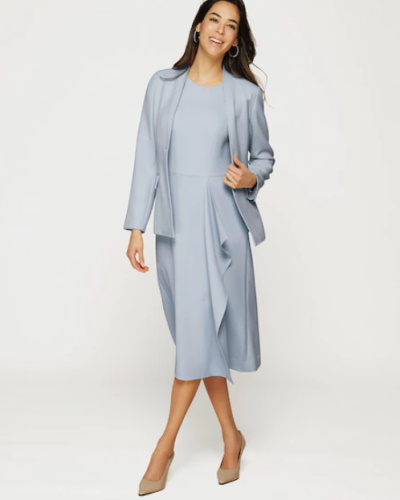 キャリア女性が集う交流会や会食への参加は、流れるようなドレープが映えるワンピースを着用。着るだけでスタイルアップできると評判のデザインに、女性同士の会話が弾みそうです。カラーは優しく親しみやすいライトブルーに。同じ素材のノーカラージャケットを羽織ると、よりクラス感のある装いが完成します。