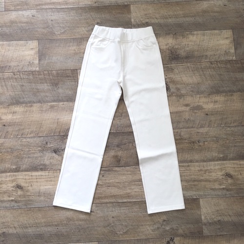 つるっとした質感のストレートパンツは、タイトすぎず、ゆるすぎない履き心地重視、感触も良い感じのものをチョイス。