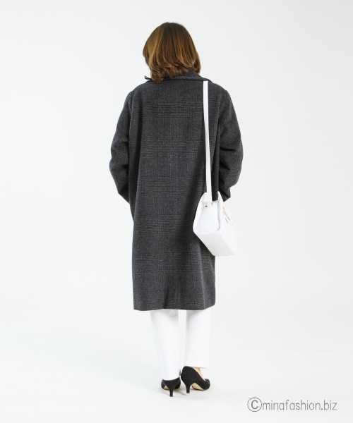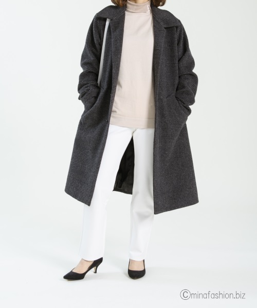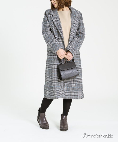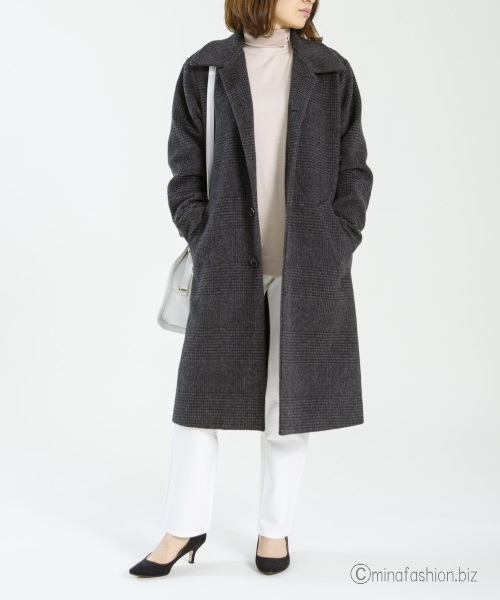 グレンチェックのロングコートと合わせ、若々しい着こなしに。