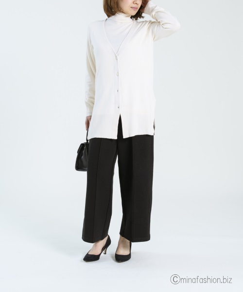 サイドスリット入りのカーディガンは、重ね着をさり気なくアピール。