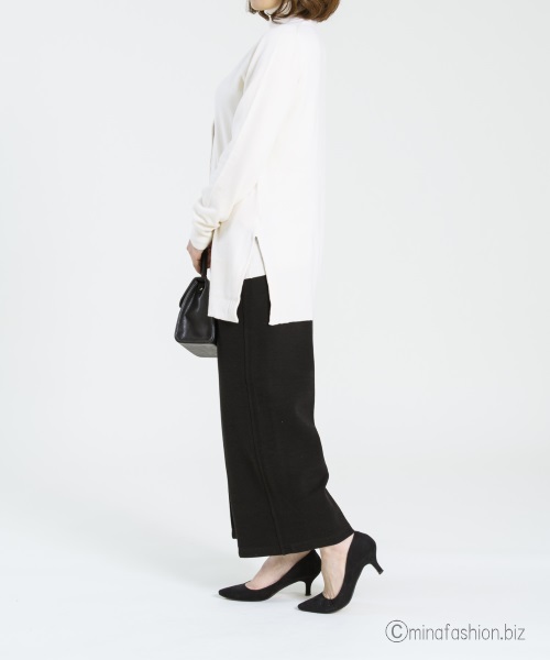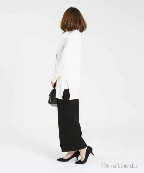 とろみのあるスリットニットは、タートルネックに一工夫されたさり気なくオシャレなアイテム。
