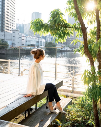 景色のきれいな水辺で過ごす休日。清潔感のある白のブラウスに細身の黒いパンツを合わせて、洗練されたモノトーンコーデに。