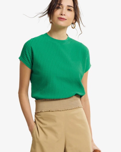 上品なコーディネートに向いているのは、ハイゲージニットのフレンチスリーブトップス。柔らかくて肌に優しく、着心地を重視したい方にもぴったり。大人の女性に人気があるのは、襟元の開きがコンパクトなクルーネックやモックネックのデザインです。フレンチスリーブのように袖が短い場合も、トータルで露出する面積が少ないことで品が良く見えます。お出かけやレストランで食事する際は、ネックレスを合わせて華やかに見せても素敵です。