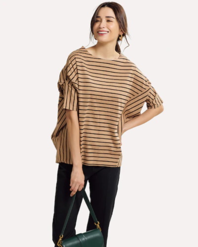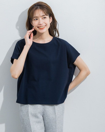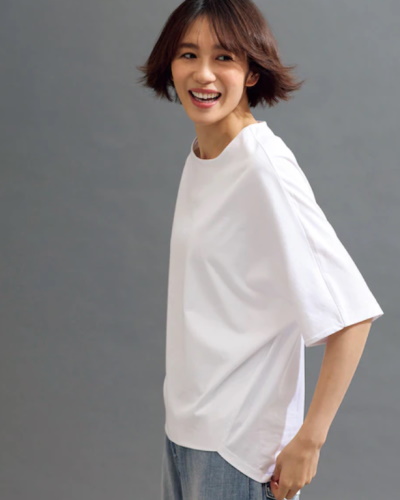 ゆったりとしたシルエットのトップスは、二の腕を含めた上半身全体をカバーできることが魅力です。オーバーサイズは体が大きく見えそうに思えますが、袖は二の腕にかかるフレンチスリーブなので、絶妙なバランスでスタイルアップすることができます。ルーズに見えずきれいめに着こなせるため、仕事や母親として過ごすシーンにも活躍するでしょう。トップスの定番として、使いやすいカラーを揃えておいてもいいですね。