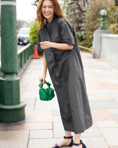 ゆったりとしたカフタンワンピースは、暑い日でも風が通り抜けて涼しいことが魅力。そのため、ふわっとしたボリュームスリーブなど、腕を覆うデザインでも夏服として選びやすいでしょう。カフタンワンピースに多いキーネックの襟元で、全体にボリュームがあってもシャープに見えるのが嬉しいですね。気温が上がる夏の日のお出かけには、サンダルを合わせてより涼しげなコーディネートに。リラックス感あふれる装いは、着映えしたい夏の旅行にも最適です。