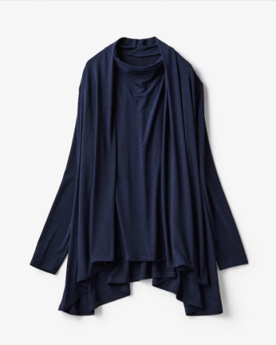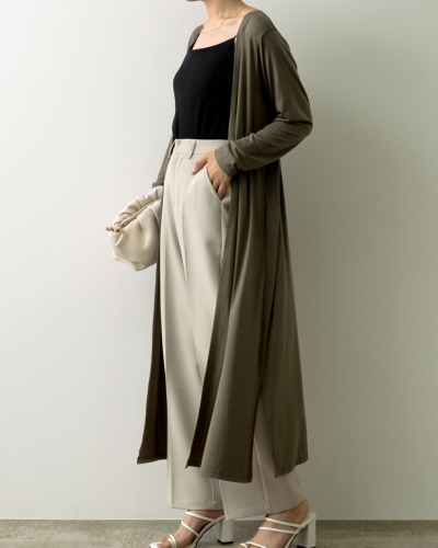 ニットより気軽に羽織れるのが、カットソー生地で作られたカジュアルなカーディガンです。薄手の生地を使用しているアイテムが多く、くるくるっと丸めてバッグに入れておけば、外出先でのエアコン対策にも役立ちます。着丈の長いロングカーディガンなら、コーデ全体をまるっと包み込んで紫外線対策ができますね。羽織ることで縦のラインが強調されるため、着やせに効果のあるIラインシルエットも簡単に作れます。手に取って素早く羽織るなら、ボタンがついていないタイプを選ぶのがおすすめです。