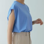 ライトブルーのリブカットソーは、細めのリブで上半身がすっきり見える設計。