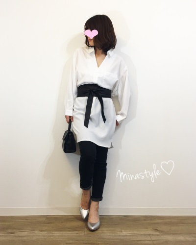 シャツワンピは一枚で着るよりもスキニーパンツを合わせたコーディネートの方がアラサーらしい印象になります。