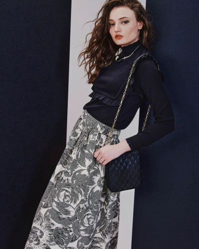 立ち襟のワンピースやミディ丈スカートなどのデザインは、まるでクラシック映画にでてくる女優のよう。