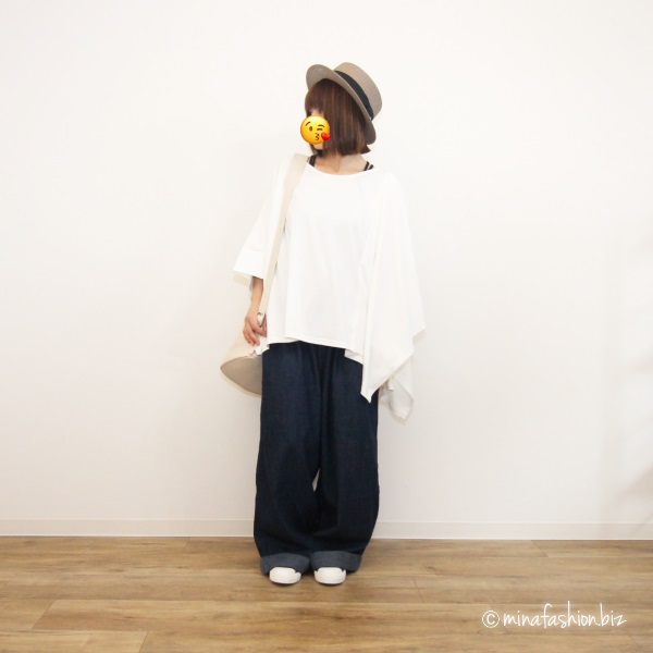 ダボダボのワイドパンツをロールアップして使用。薄手のデニム生地で、固くないから動きやすいです。先ほど登場したアシメシャツをここでも使用。ゆる×ゆる出可愛らしさを引き立てたコーディネートです。