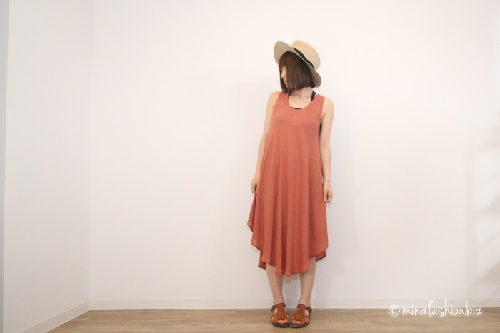 タンクトップワンピース。ウエスト周りにアクセントありで、とてもシンプルなスウェット素材です。こうした素材の場合、透け感が気になったりするものですが、このアイテムは問題ありませんでした。生地質も良いですし、アレンジが効きそうなシンプルなデザインも良い印象。