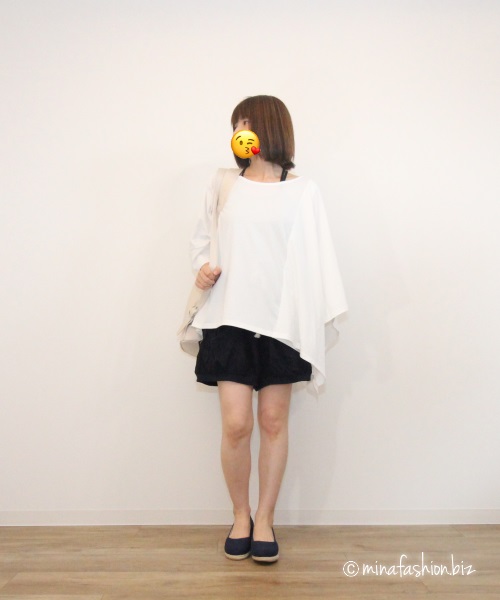 ショートパンツは大人らしく、ハーフ丈のゆとりのあるデザイン。ラフなアシメシャツを使ったゆるカジコーディネートに。個性的なデザインのTシャツは、左腕が布で覆われています。デザイン性の高さも魅力の一つです。厚手のシャツなので、秋まで使えそうです。