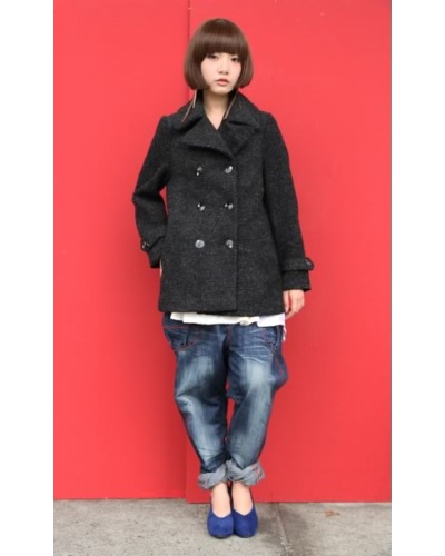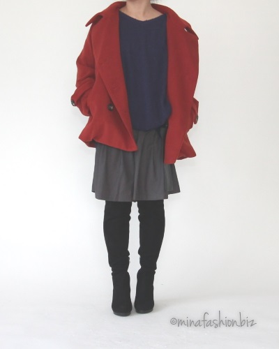 ネイビーのニットにテラコッタのピーコートを合わせて。