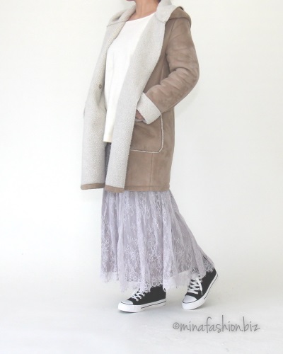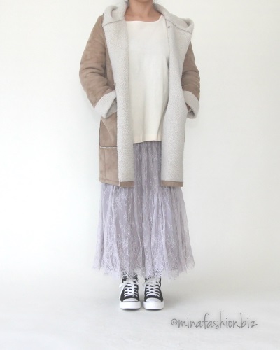 アウターは別ブランドですが、アイボリーのニットに合わせたので、ちょっぴり上品なアウターをチョイス。