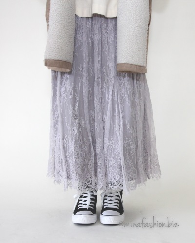 レーススカートはガーリーな印象ですが、カラーチョイスと合わせるアイテムによっては大人っぽく使えます。