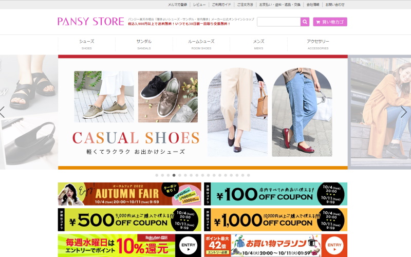 パンジーは足に優しいコンフォートシューズで有名な老舗ブランドで、取り扱う商品は国内外の自社工場で製造されています。