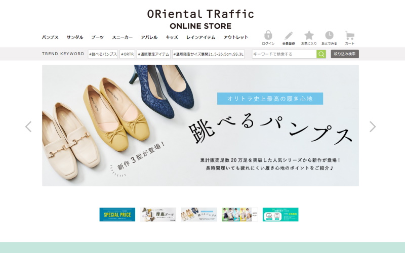 シーンに合わせて選べる「オリエンタルトラフィック」、ナチュラル&フェミニンがコンセプトの「ダブルエーオリエンタルトラフィック」、スポーティな「オーアールティーアール」、モードな「ニカル」が揃い、トゥやヒールにトレンドを取り入れたシューズがズラリと並びます。