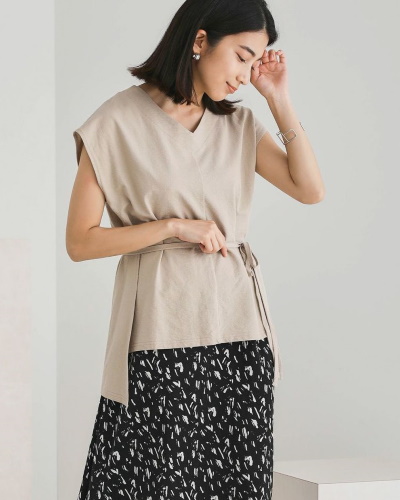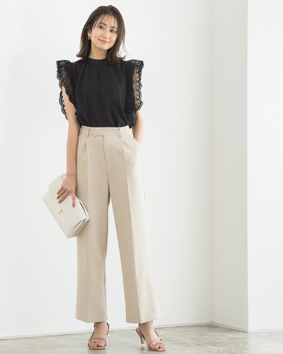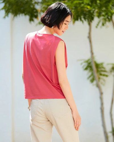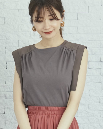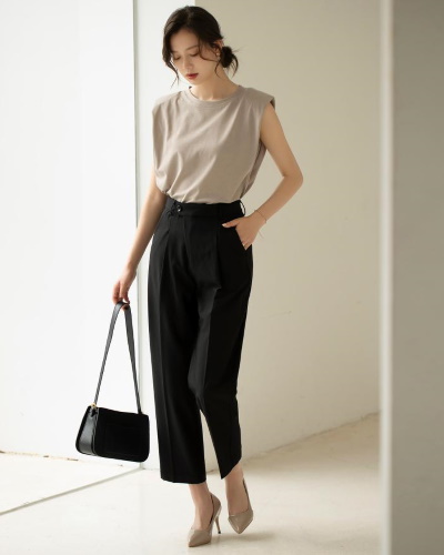 肩の部分を折り込んだタックスリーブと呼ばれるデザインは、肩や二の腕のカバーに効果があり、装いに今っぽさが漂います。肩ががっちりしている人は柔らかい素材を、なで方の人は張りのある素材を選ぶと良いでしょう。ベージュのタックスリーブトップスに黒いパンツを合わせれば、通勤向けのシャープなスタイルに。完全なノースリーブに比べて露出が少なく、オフィスに合う奥ゆかしい印象です。