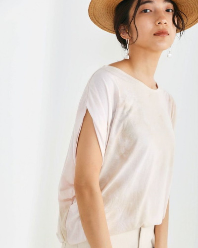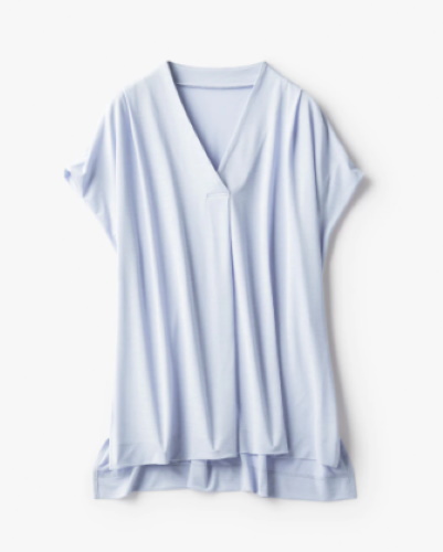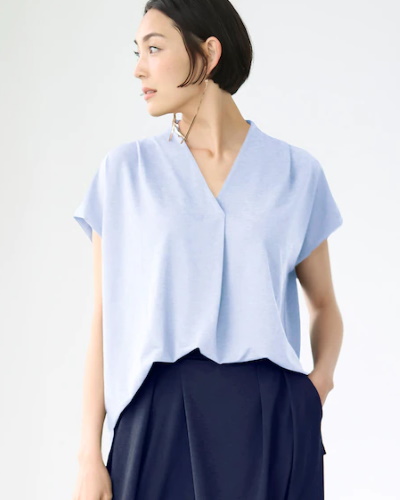 UVカット効果のあるスラブ生地を使い、日よけアイテムとしても活躍するフレンチスリーブブラウス。二の腕のタイプを選ばない一枚です。なお、同じ素材を使ったシリーズには、タックデザインのワイドパンツも用意されているので、組み合わせてコーディネートを楽しむこともできます。ストンと着るだけで決まるデザインは、朝の着替えを短縮したいときにも活躍します。
