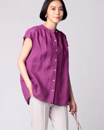 繊細な透け感と光沢で差がつくリネンのフレンチスリーブブラウス。肩の下と背中側のヨークにギャザーが入ることで、肩幅の広い人にも着こなしやすくなっているのがポイントです。腕の一番太い部分がきれいに隠れて、ノースリーブだと心配な方でも取り入れやすいですよ。気分を上げてくれる美しいカラーも魅力的です。
