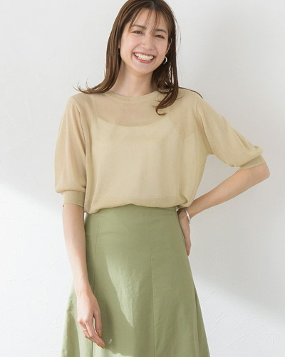 夏の五分袖を選ぶときに注意したいのは素材です。袖が長いと重く見えないか心配な方は、こちらのようなシアー素材にすると軽やかに見えます。シアーといっても繊細なラメ糸を使用しているので、透け方がとても上品です。これなら職場やきちんとした場所にも着て行けますね。薄手で通気性が良いので暑さも気になりにくいです。