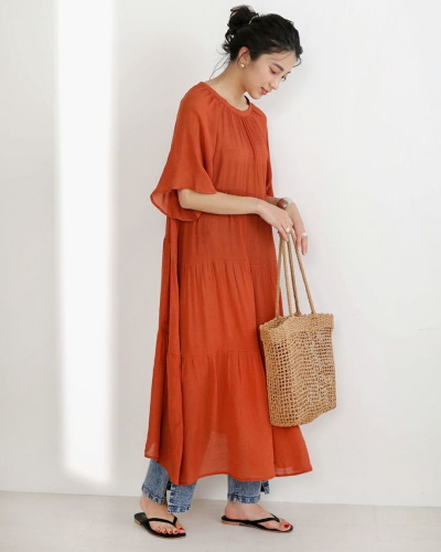 五分袖とフレア寄りのデザインで二の腕が目立たないワンピース。シアー素材が夏らしく、薄いのでレイヤードスタイルにも使いやすいです。かごバックとトングサンダルがセットになっていて、季節感のあるコーディネートが完成します。肩に切り替えがないので肩幅も気になりません。