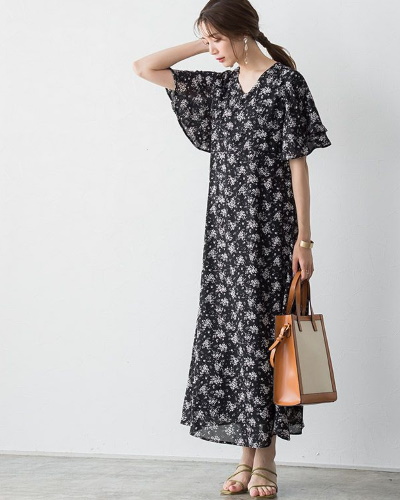 程よい抜け感が漂うフレアスリーブのワンピース。袖口にたっぷりの余裕があるため、二の腕のたるみや幅を丸ごと隠すことができます。薄手のジョーゼット素材が涼しく、夏に着る一枚として最適です。シルエットが女性らしいので、デートや食事に着て行くのにもぴったり。落ち着いた花柄が大人向きです。