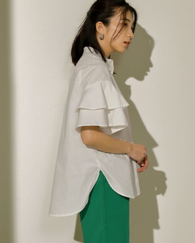 長くトレンドが続いている白いブラウスにも、二の腕カバーに効くアイテムがたくさん登場しています。ボリューム感のある二段のフレアスリーブは、気になる部分をきれいに隠して、袖から出た腕を華奢に見せてくれます。すっきりとしたハイネック、前後差のあるラウンドカットなど、バランス良く着こなせる一枚です。