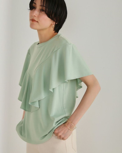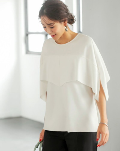 波を打つようなドレープが美しいケープスリーブのトップス。二の腕を目立たせないだけでなく、デコルテのボリュームアップにも効果的です。デザインが視線を上に集めるため、小柄な方や脚を長く見せたい方のコーディネートにもおすすめ。モード感あふれるデザインで、体型カバーをしているように感じさせません。