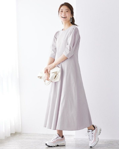 袖のタックが縦のラインを強調して、カバーしながら細く見せてくれるワンピースです。袖以外はシンプルなフレアワンピースで、30代や40代にも着こなしやすくなっています。リップル素材という凹凸のある素材を使っているため、肌に張りつきにくいところも魅力です。後ろはボタン留めのVネックで、フロントボタンにして2wayの着こなしが楽しめます。