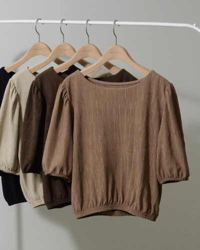 表面に凹凸のある素材でサラッと着られるパフスリーブトップス。肩や腕ががっちり見えがちな方も、ギャザーが少ないデザインなら、気になるパーツを隠してふんわり装うことができます。カラーは、モカ、ブラウン、ベージュ、ブラックの4色展開です。同じ生地のワイドパンツもあり、セットアップとしても楽しめます。