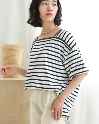 全体がビッグシルエットのトップスは、袖の幅も十分にあり、腕の太さとの対比が細見せにつながります。サイドにスリットが入っているので、前身頃をボトムスに入れるスタイルも作りやすいです。ボーダートップスには着太りする印象がありますが、スクエアネックやパイピング、そして思い切ったサイズ感が効いていて、すっきりと着こなせる一枚になっています。