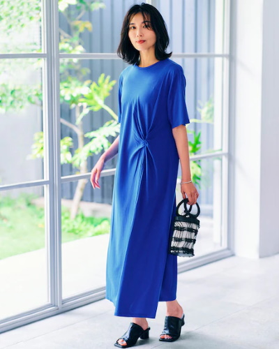 五分袖のワンピースを主役にすれば、二の腕が気にならない夏の定番スタイルが作れます。五分丈の袖は肘のあたりまでが隠れるので、二の腕のカバーはもちろん、露出を抑えた上品さを狙えます。単色のシンプルな一枚を選ぶと、トレンドの小物を合わせた多彩なコーディネートを楽しめるでしょう。