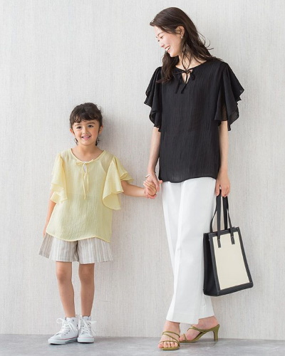 立体的なフレアスリーブが二の腕を隠して、華やかな印象に見せてくれるブラウス。ママはブラックで大人っぽく、キッズはイエローでキュートなリンクコーデに。被って着るだけで体型カバーとコーデが完了するので、準備の時間を短縮したいママにもおすすめです。前後2wayで着用できるデザインで、気分やコーディネートに合わせて使い分けが可能です。