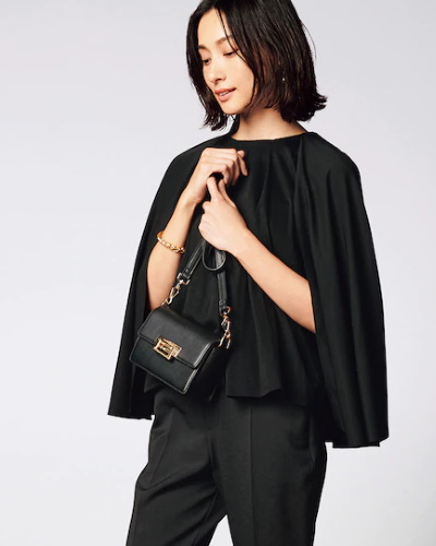 黒のケープスリーブブラウスと同色のパンツを合わせたオールブラックの着こなしです。ケープスリーブにはいくつかの種類があるのですが、こちらのブラウスはノースリーブにケープ状の生地を重ねたデザインで、モードな雰囲気を演出できます。画像のようにスリットから腕を出したり、ケープを肩に掛けてノースリーブにしたり、一枚でまったく違った着方を楽しめるのも嬉しいですね。ヒールの靴や上品な小物で装えば、オケージョンスタイルにもぴったりです。