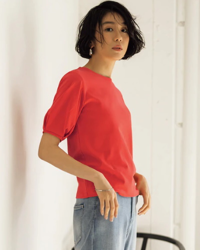 レッド系のパフスリーブTシャツとライトブルーのデニムパンツで、夏らしいカジュアルスタイルに。ふんわりとしたパフスリーブは、二の腕を隠しながら甘さをプラスしたいときに便利です。控えめな膨らみはほのかに甘く、ボリュームがあると華やかに見えます。パフが軽めのデザインTシャツを選べば、デニムスタイルを少しだけ女性らしく仕上げたいときなど、日常使いがしやすいでしょう。