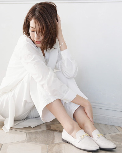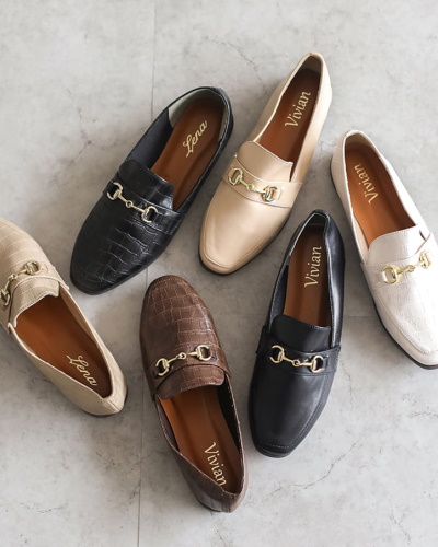 気持ちスクエアトゥ気味のつま先で、大人のコーディネートにマッチするローファーです。コーディネートにトラッドな印象をプラスしたいときに。ポイントは甲についたゴールドのビットモチーフ。素材はスムースレザータイプと型押しタイプの2種類です。日常使いするのはもちろん、軽くてかさばらないので、室内履きや旅行のサブシューズとして持っていくのもおすすめ。