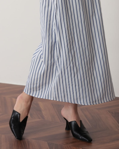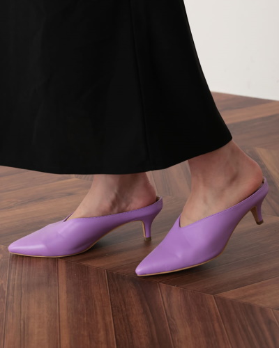 美脚効果の高さで選ぶなら、ツンと尖ったポインテッドトゥのミュールがベストです。こちらのアイテムはさらに履き口が深めのVカットなので、Wの効果で足を長くきれいに見せてくれますよ。ヒールは5cmと適度な高さなので、細身ですが安定しています。カラーバリエーションは5色。おすすめは発色がきれいなラベンダーとイエロー。ラベンダーは優しい印象のカラーで、春の花々のように可憐な足元を演出します。