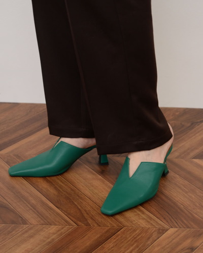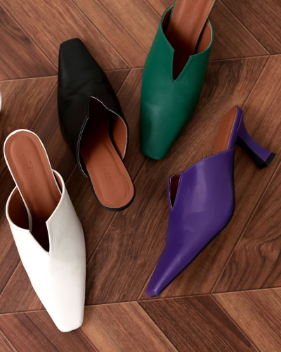 Vカットのスリットでモードな装いを叶えるミュール。視覚効果で足をすっきり見せてくれて、美脚の視点でもおすすめのデザインです。ポイントをカッティングのみに絞ったシンプルな作りで、カジュアルコーデからフェミニンコーデまで対応します。今季トレンドのパープルやグリーンがラインナップに含まれ、足元から効果的にトレンドを取り入れることができるでしょう。お気に入りのカラーで春のおしゃれを楽しみたいですね。