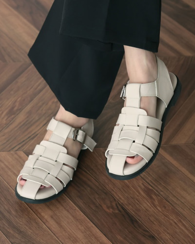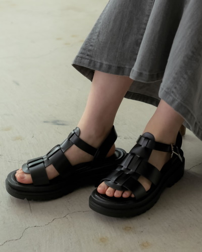 足がほっそりと見えるスクエアトゥのグルカサンダルです。甲の編み込みがシンプルコーデのアクセントになり、さり気なく今季らしさを印象づけます。女性らしいファッションにもマッチし、スカートやワンピースに合わせれば今っぽい雰囲気に。底の高さは2.5cm。履きやすくて自然に見える高さですね。ベーシックからきれいめカジュアルを好む方には、恐らくこのタイプが一番使いやすいのではないでしょうか。