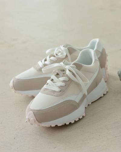 ニュアンスカラーの配色で使いやすいカジュアルスニーカー。前、横、後ろのどの角度から見てもフォルムがきれい、かつボリュームの加減もちょうどよく、きれいめファッションにも合わせやすいデザインです。つま先に向かって細くなる切り替えで、重さを感じさせないところがいいですね。ソールには3cmの厚みがあるため、気負いなくスタイルアップできるのも好ポイント。万能カラーのベージュと優しいニュアンスのピンクが揃っています。